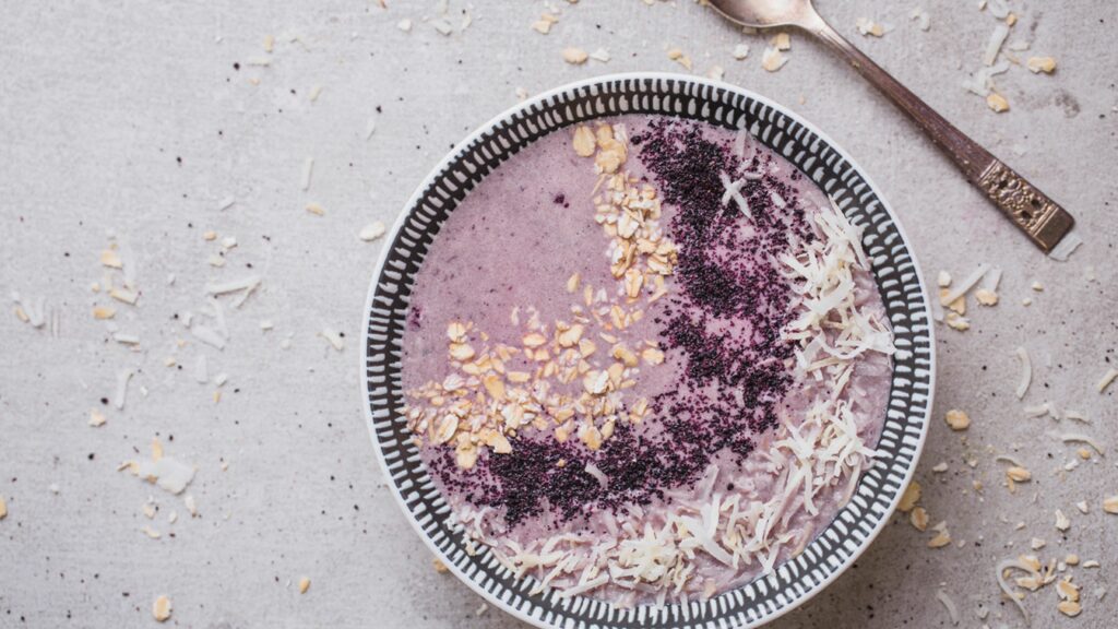 3. Jaa kulhoihin ja koristele granolalla, goji-marjoilla, mustikoilla, kookoksella ja chia-siemenillä.