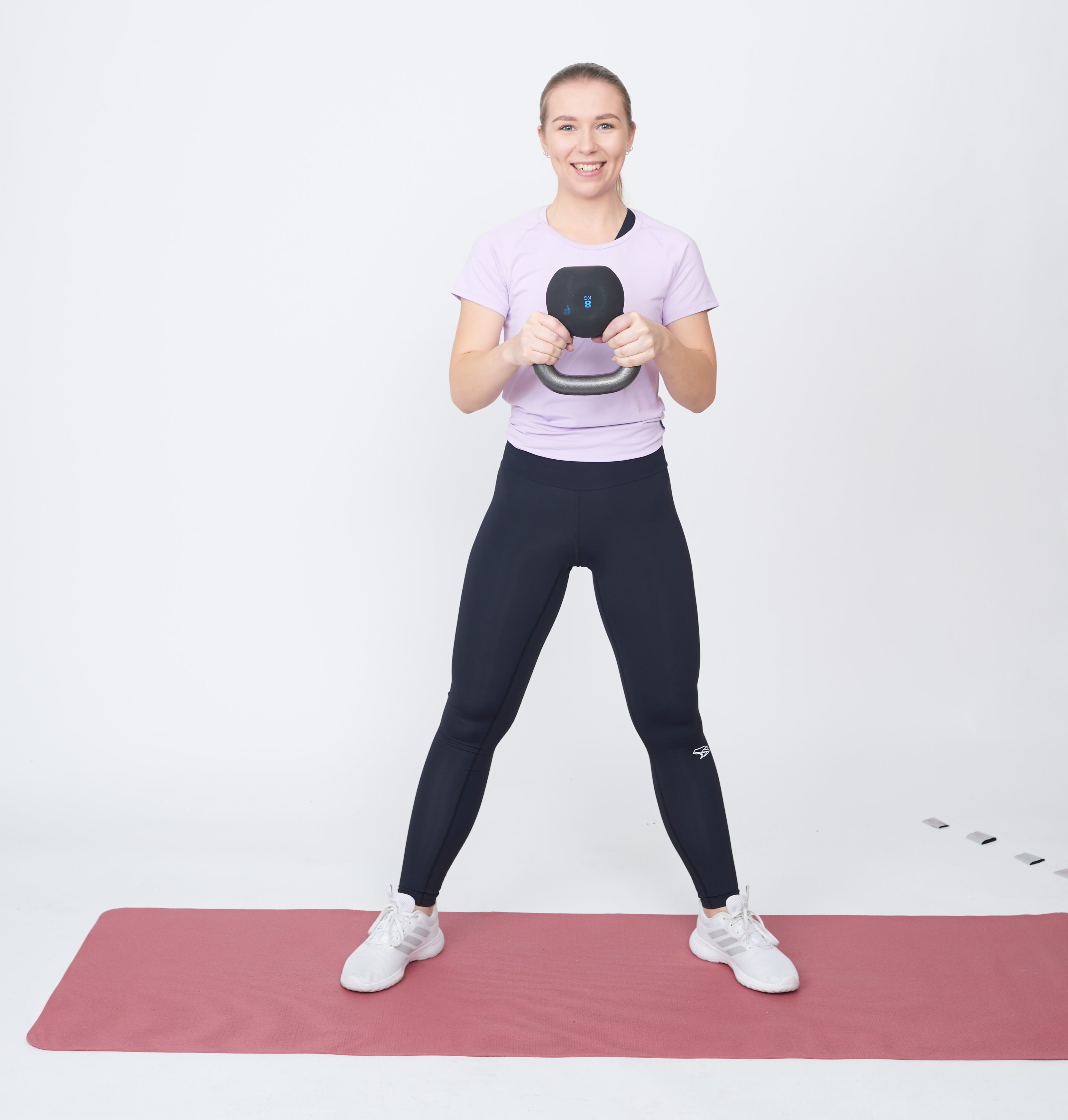 Aseta jalat hartioita hieman leveämmälle, polvet ja varpaat osoittavat auki etuviistoon. Ota molemmilla käsillä kuulan kahvasta kiinni, ja lähtöasennossa anna kuulan roikkua suorilla käsillä. Kyykkää lantio taakse ja tuo kuulan pohja kohti lattiaa. Säilytä selkä pitkänä ja katse eteenpäin.