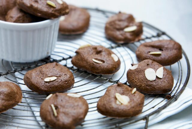 Kaakao-mantelimarengit 24 marenkia Valmistusaika 2 tuntia 2 isoa kananmunaa 1,2 dl hienoa sokeria ¾ tl maissijauhoja hyppysellinen suolaa ½ tl manteliuutetta 2−3 rkl kaakaojauhetta 2−3 rkl mantelilastuja 1. Lämmitä uuni 110-asteiseksi. Laita leivinpaperit valmiiksi kahden uunipellin päälle ja voitele ne. 2. Erottele munista valkuaiset ja keltuaiset. Vaahdota valkuaiset kovaksi vaahdoksi. 3. Sekoita keskenään sokeri, maissijauhot