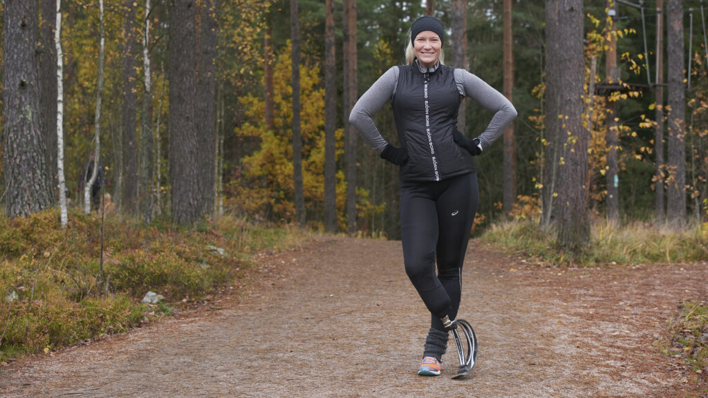 – Hassua kyllä, seuraava vaihe eli juoksemaan oppiminen oli paljon helpompaa kuin kävelemään oppiminen. Se johtuu ehkä siitä, että juoksuproteesini maahan osuva osa on käyrä, kun taas käyttöproteesi töksähtää maahan. Mutta voi hyvin sanoa, että minä tosiaan osasin juosta ennen kuin osasin kävellä.