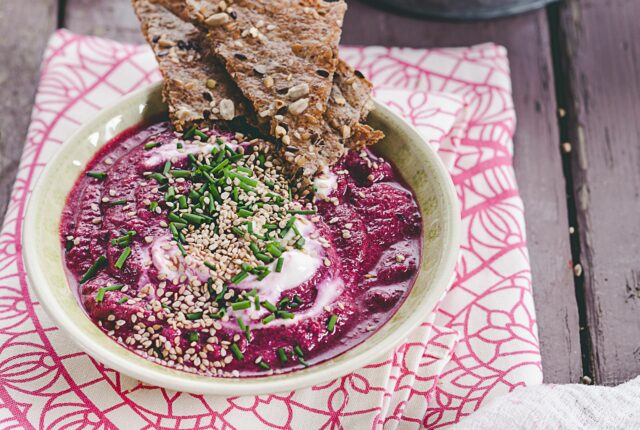 Punajuurihummus on nättiä ja hyvää. Pannuleipä sopii täydellisesti viikonloppuaamun brunssille.