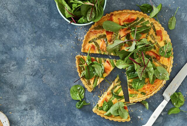 Savulohipiirakka täytetään kasviksilla ja lohella, sekä koristellaan pinaatilla, lehtimangoldilla ja seesaminsiemenillä.