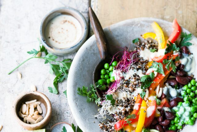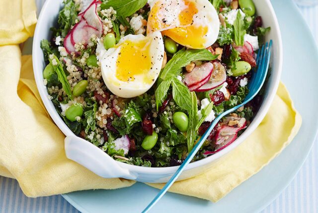 Huimasti proteiinia ja kivasti kuitua. Tämä salaatti pääsee treenarin lautaselle.