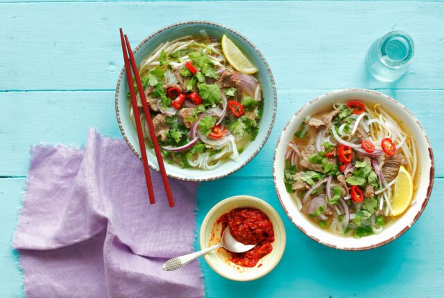 Vietnamilainen pho-keitto valmistetaan naudanlihasta, mausteisesta lihaliemestä, riisinuudeleista ja yrteistä. Saa ryystää!