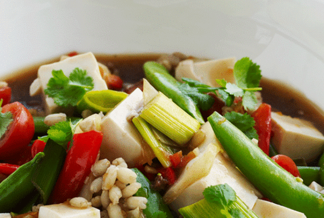 Kaikki kasvikset käyvät tähän tofuruokaan: kaali, parsa, sipuli, retiisi ja kurkku.