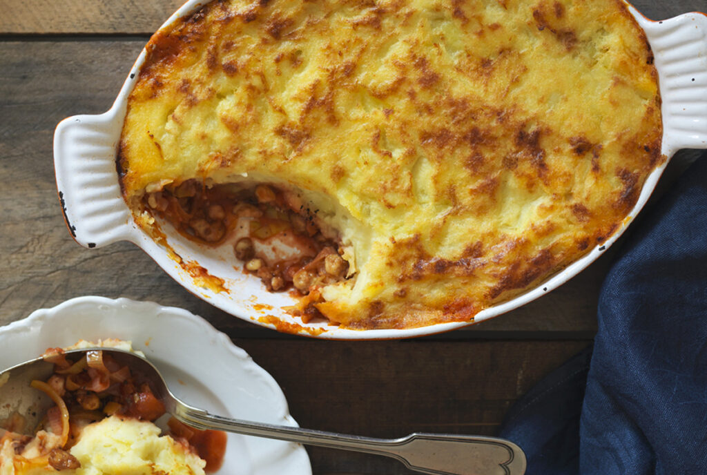 Kuudelle, valmistusaika 2 tuntia Ainesosat: Täyte: 2 rkl oliiviöljyä 1 iso sipuli 1 purjo 2 isoa porkkanaa 300 g quorn-rouhetta 300 g kiinteää tofua 2 valkosipulinkynttä 1 tl kuivattua timjamia ½ tl kuivattua rosmariinia 400 g (1 tlk) tomaattimurskaa 250 ml kasvislientä suolaa mustapippuria Kuorrutus: 1,25 kg jauhoisia perunoita 80 g vegaanista margariinia 2 rkl