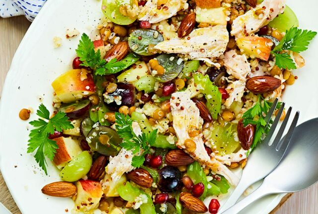 Neljälle, valmistusaika 25 minuuttia Ainesosat: 4 kananmunaa 1 dl maitoa 1 kourallinen tuoreita yrttejä, esim. persiljaa, ruohosipulia, kirveliä 2 kevätsipulia 2 rkl suolatonta voita 2 rkl oliiviöljyä 2 viipaletta kokojyväleipää 250 g vihreää parsaa 4 sellerin vartta 225 g mansikoita 2 dl hillosipuleita 2 rkl saksanpähkinämurskaa 75 g fetajuustoa 1 kourallinen tuoreita basilikan lehtiä suolaa
