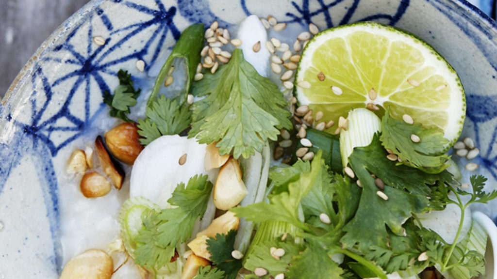 Aasialainen congee on vähän kuin riisipuuro tai risotto. Nyt se tarjoillaan mehukkaan broilerin ja paahdettujen pähkinöiden kera.