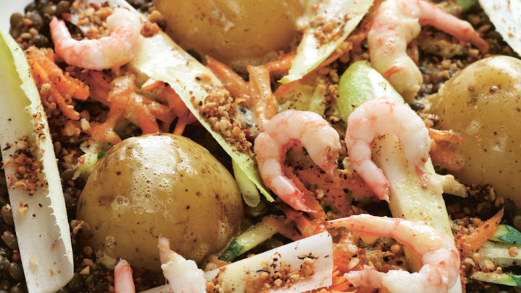 Linssisalaatin lisukkeena tarjoillaan paahdettua mantelijauhoa ja perunaa