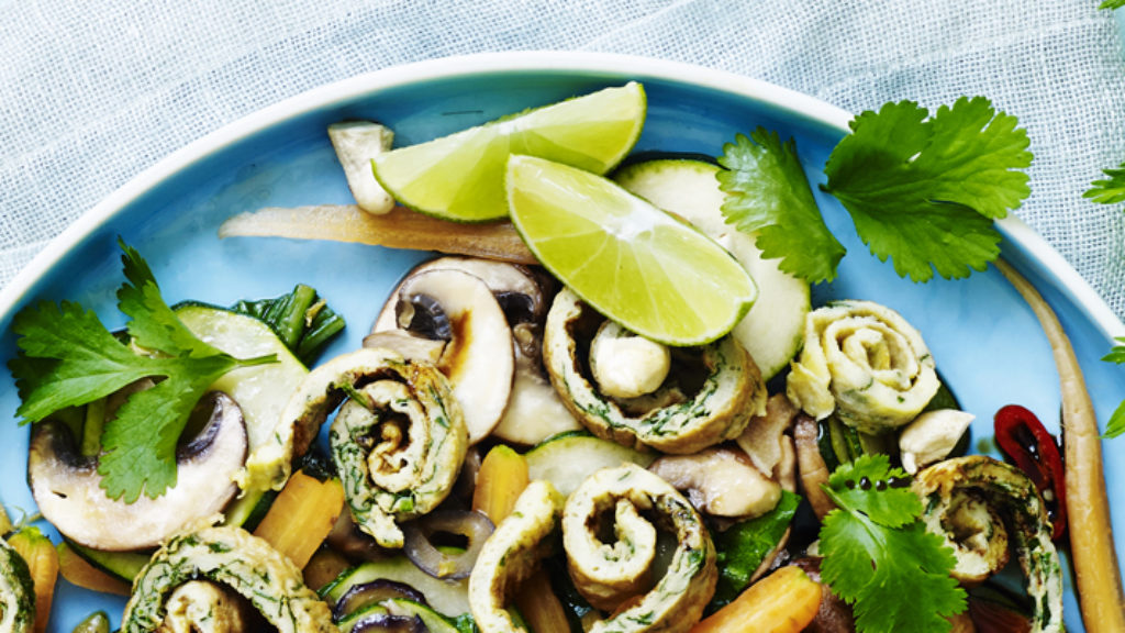 4 Nosta pannu hellalta ja sekoita joukkoon soijakastike ja limetinmehu. Levitä munakasrullat vokin päälle ja mausta korianterilla ja cashewpähkinöillä.