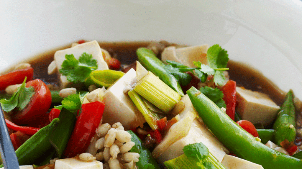 5. Lisää tomaatit ja herneet. Anna porista pari minuuttia. Vähennä lämpöä ja mausta seesamiöljyllä, hienonnetulla valkosipulilla ja raastetulla inkiväärillä. Lisää chilitahnaa maun mukaan.
