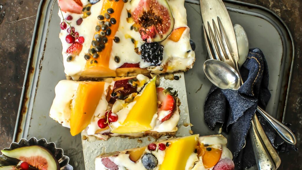 Helppo hedelmäinen jäätelökakku syntyy valmiista jäätelöstä, kekseistä ja hedelmistä.