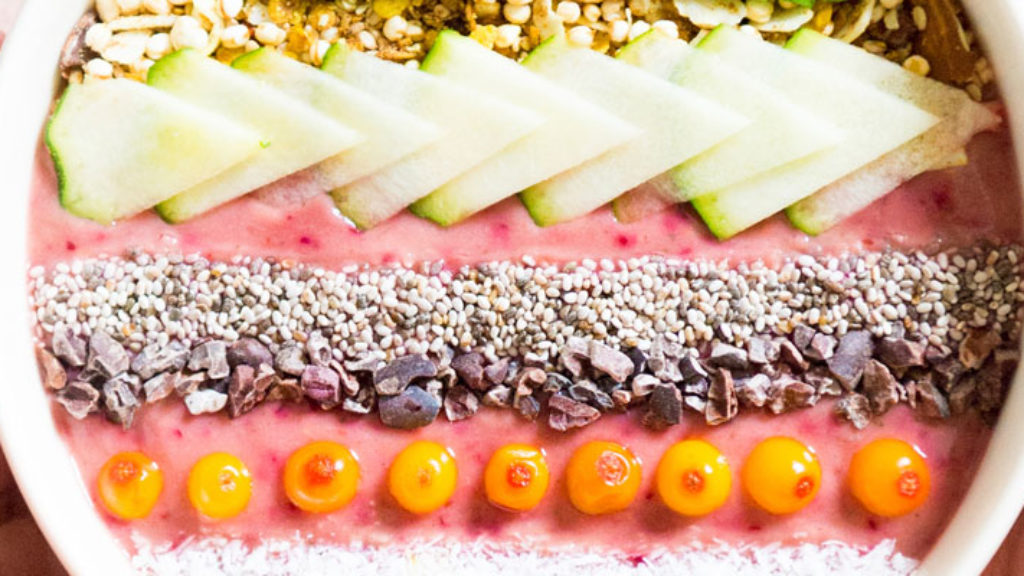 Koristele haluamallasi tavalla, esimerkiksi mysliä, chia-siemeniä, kaakaonibsejä, kookosta, mehiläisen siitepölyä, tyrnimarjoja, minttua, muutama kesäkurpitsakolmio.