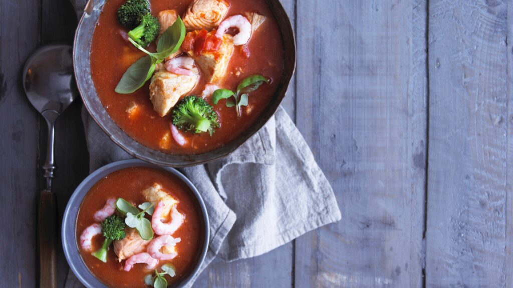 Raikas tomaattipohjainen kala-katkarapukeitto maustetaan inkiväärillä ja sitruunalla.