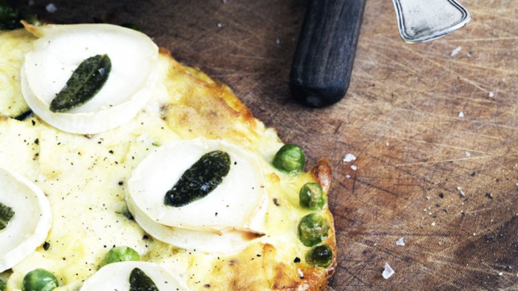 2 Kaiva herneet paloista ja ota 1/3 sivuun salaattia varten. Ripottele loput herneet omeletin joukkoon. Taita varovasti munakas kahtia. Leikkaa vuohenjuusto viipaleiksi ja asettele munakkaan päälle. Koristele salvianlehdillä, mausta suolalla ja pippurilla ja paista vielä pieni hetki.