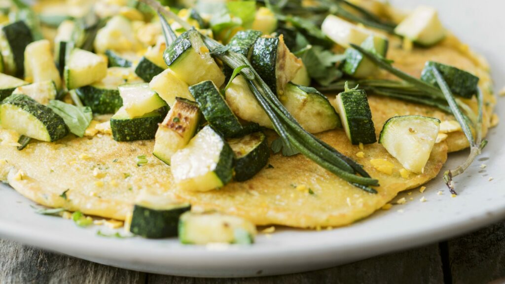 4. Lämmitä kesäkurpitsaseos uudestaan ennen tarjoilua. Jaa omeletit lautasille ja täytä ne kesäkurpitsalla.