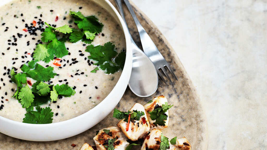 5. Annostele keitto kulhoihin ja koristele seesaminsiemenillä ja korianterilla. Tarjoile broilerin kera.