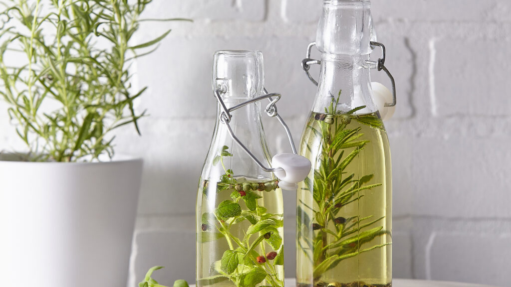 - Lisää toiseen pulloon basilikanoksa ja toiseen rosmariininoksa. Kaada kumpaankin pulloon 2 ½ dl öljyä.