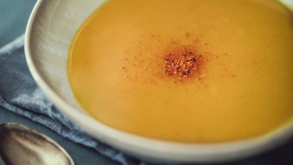 2. Kuumenna oliiviöljy kattilassa ja lisää salottisipuli, valkosipuli ja hyppysellinen suolaa. Kuullota miedolla lämmöllä noin 6−8 minuuttia, kunnes sipulit ovat pehmenneet. Lisää joukkoon kurpitsa ja peruna ja kypsennä 5 minuuttia. Lisää mausteet ja kypsennä minuutti ja lisää sitten kasvisliemi.