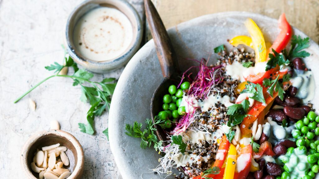 5. Jaa kvinoa, herneet, pavut, paprikat ja idut lautasille. Koristele yrteillä, manteleille ja limelohkoilla. Valuta päälle tahinikastiketta.