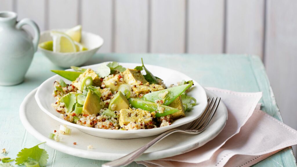 7. Kuohkeuta kvinoa haarukalla sekoittaen. Kuivaa sokeriherneet talouspaperilla. Kaada kvinoa, herneet, tofu, avokado ja kevätsipuli kastikekulhoon. Sekoita.
