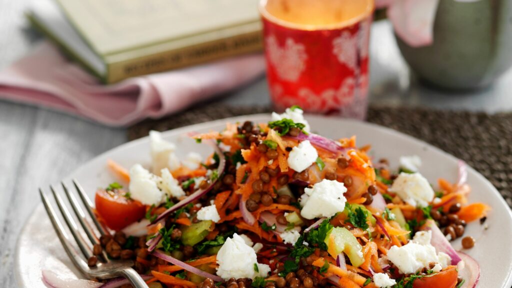 Lämmin linssisalaatti on erinomainen lounas, sillä siinä on sopivassa suhteessa proteiineja, hiilihydraatteja ja kuituja.