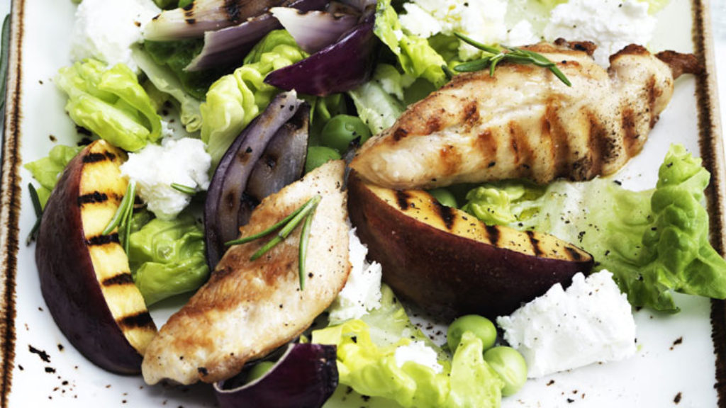 4 Ripottele herneet ja murustettu juusto salaatin päälle. Koristele broilerinpalat rosmariinilla ja nosta salaatin päälle.