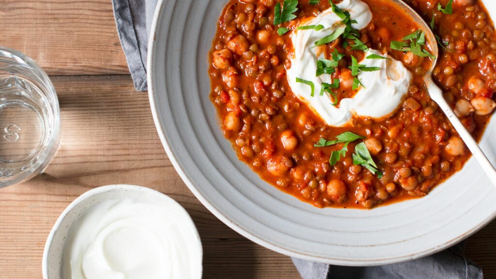3. Kaada taas liha kasariin. Lisää linssit ja kikherneet. Peitä seos lihaliemellä ja paseeratulla tomaatilla. Kuumenna ja hauduta 40–45 minuuttia, kunnes linssit ja kikherneet ovat todella pehmeitä.