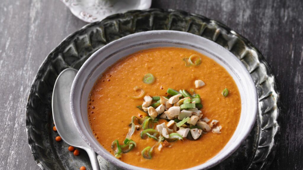 5. Annostele keitto kulhoihin. Koristele pähkinämurulla ja kevätsipulilla.