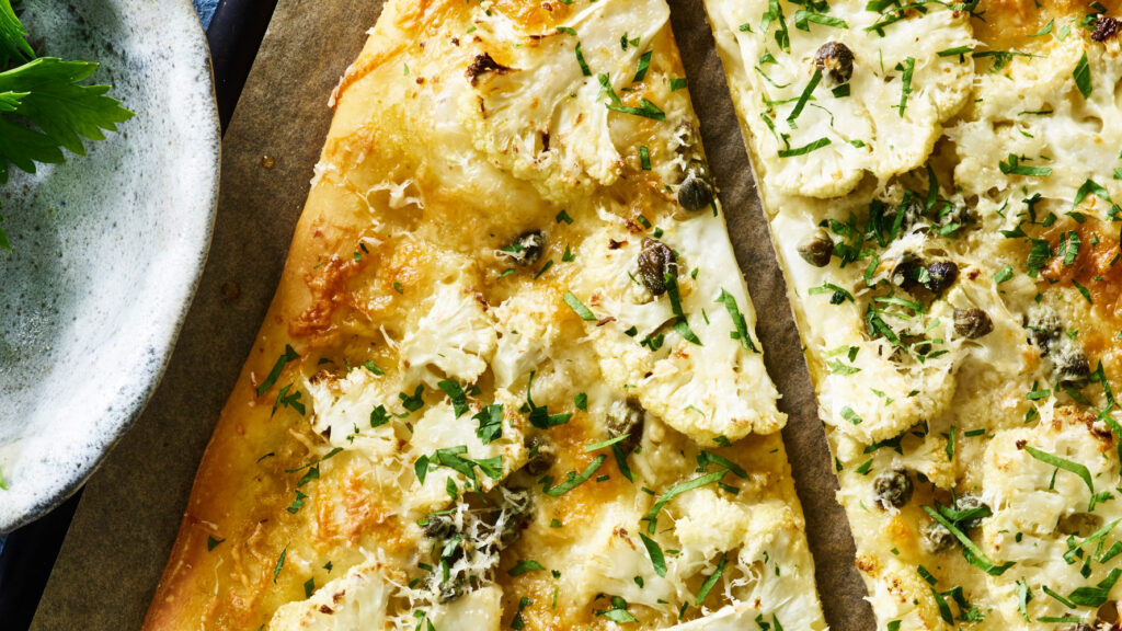 3. Lisää päälle kaprikset ja ripottele sekaan chiliöljyä. Paista pizzoja noin 10 minuuttia, kunnes juusto on sulanut ja kukkakaalit ovat paahtuneita.