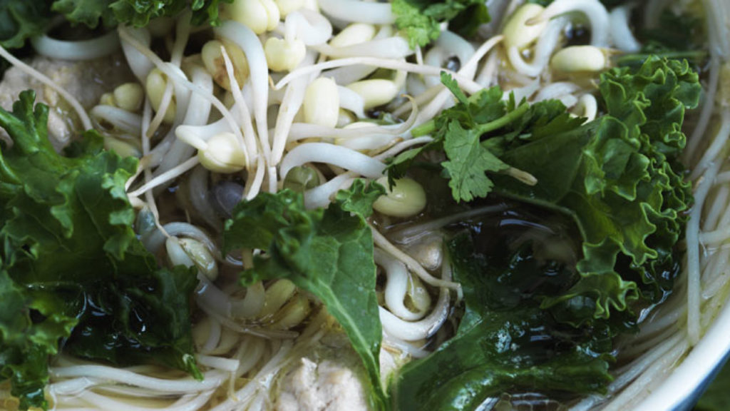 2 Puhdista lehtikaali, poista kova lehtiruoti ja silppua pieneksi. Upota lehtikaali ja nuudelit soppaan, kun keittoaikaa on jäljellä 5 minuuttia.
