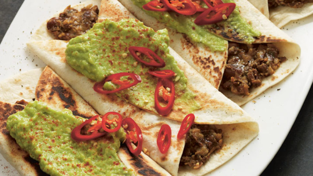 6. Lämmitä uuni 100 asteeseen. Aseta pellille 8 tortillalettua ja jaa papuseos letuille. Taita jokaisen tortillan reunat keskelle ja paina kiinni seokseen. Kuumenna kuiva paistinpannu keskilämmölle. Paahda jokaista quesadillaa molemmilta puolilta parin minuutin ajan. Nosta lämpimään uuniin.
