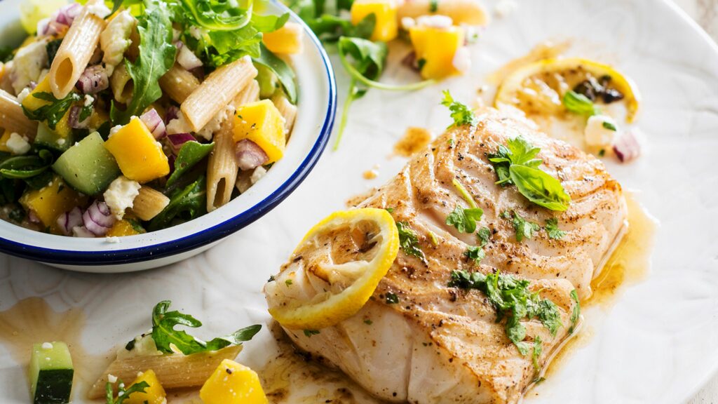 4. Kalan kypsyessä keitä pasta. Hienonna sipuli ja kuutioi mango. Murskaa haarukalla fetajuusto muruksi. Puolita kurkku, poista siemenet ja kuutio. Kun pasta on kypsää, huuhtele kylmässä vedessä ja valuta vesi pois huolellisesti. Siirrä pasta suureen kulhoon ja sekoita joukkoon ¾-osaa rukolasta, sipuli, mango, kurkku ja feta. Mausta oliiviöljyllä, suolalla ja pippurilla. Hienonna loppu rukola.