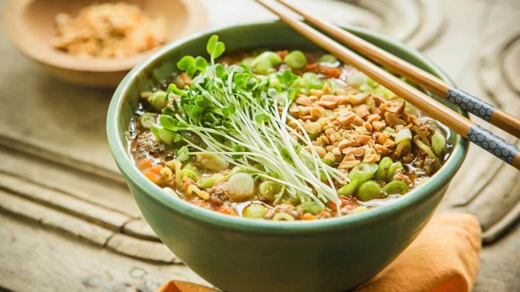 6. Koristele sipulisilpulla, krassilla ja pähkinöillä. Tarjoile soijakastikkeen kera.