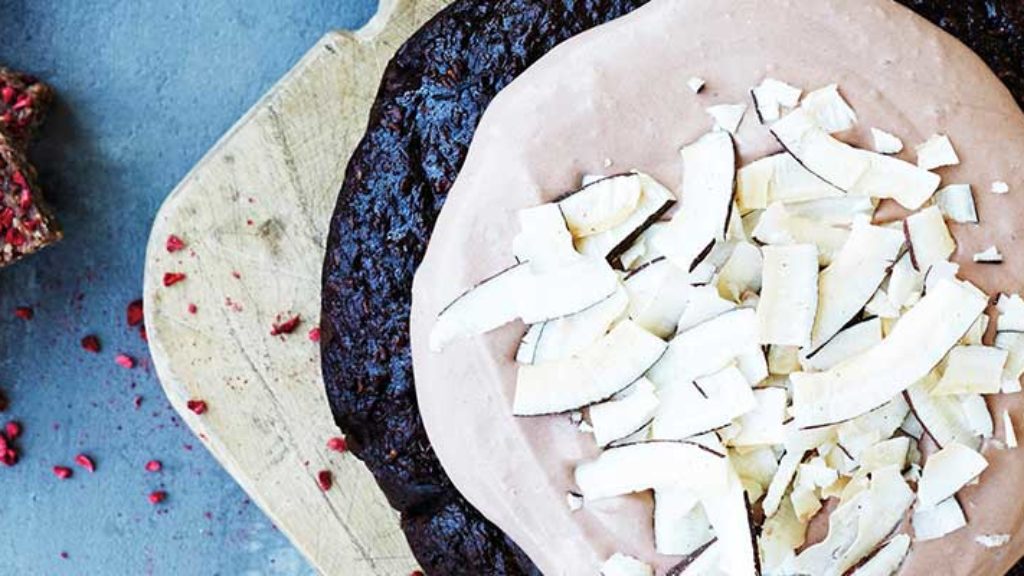 Kookos-suklaakakku saa mehevyytensä taateleista ja banaaneista.