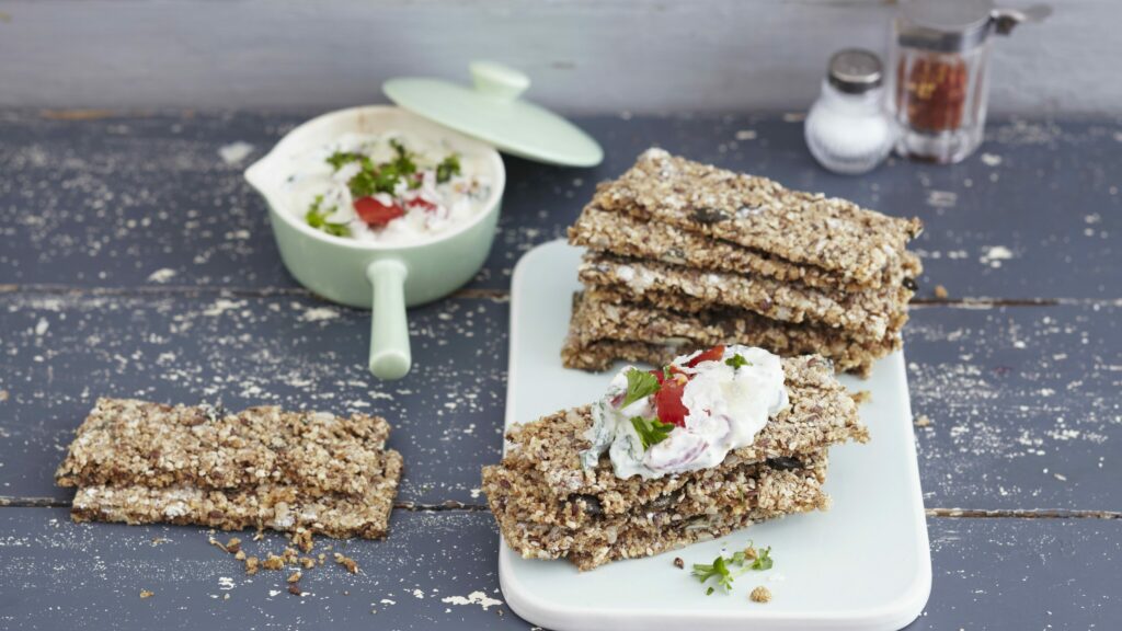 5. Tee levite: Silppua lehtipersilja ja kuutioi kirsikkatomaatit. Sekoita ne jogurtin joukkoon ja mausta suolalla. Tarjoile näkkärin kanssa.