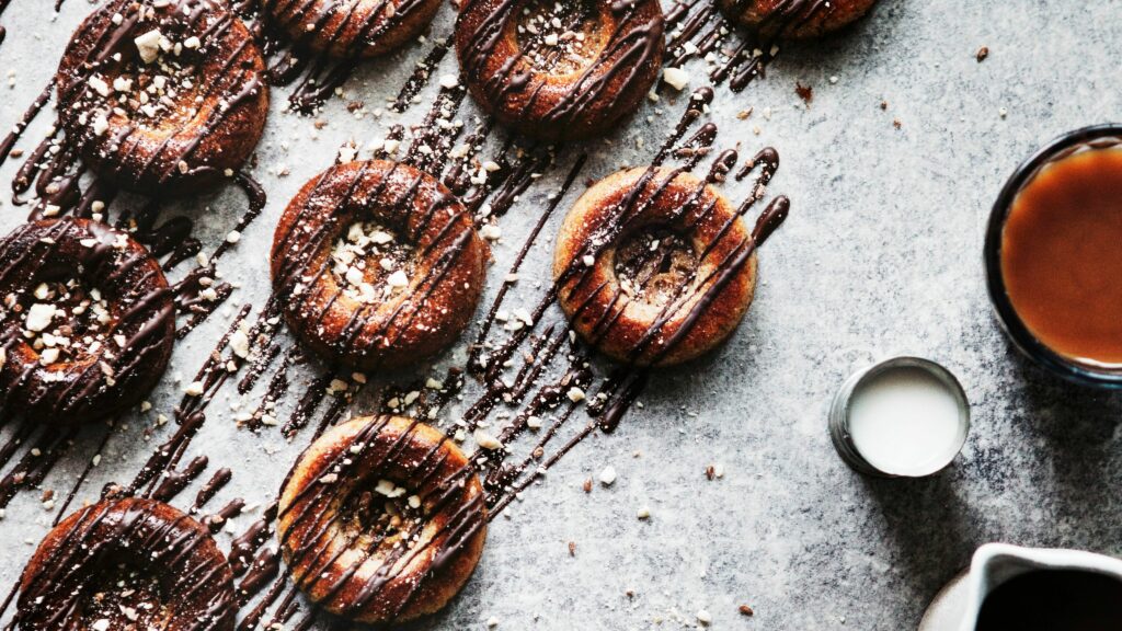 - Ennen tarjoilua sirottele ensin seesamipatukkamurut ja pähkinämurska donitsien päälle ja lorottele sitten perään kuorrute.