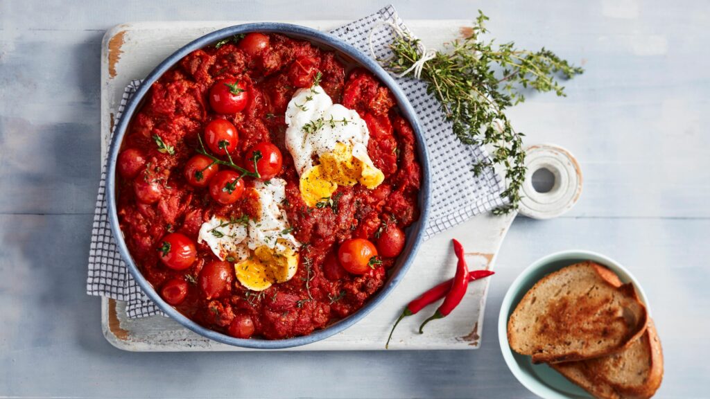 Shakshuka tarkoittaa arabiaksi sekoitusta. Se on ruokaisa aamiaispannu, jonka avulla pärjää pitkälle iltapäivään.