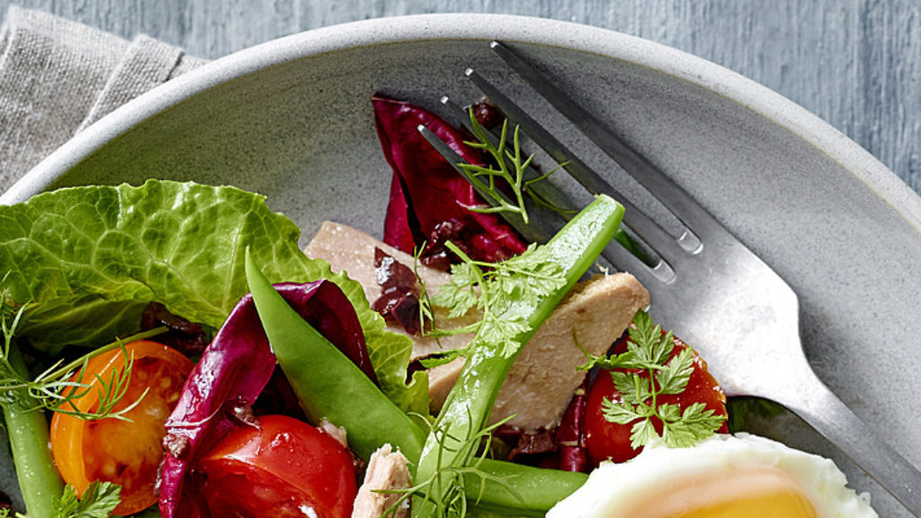 Nizzansalaatti papujen ja oliivikastikkeen kera