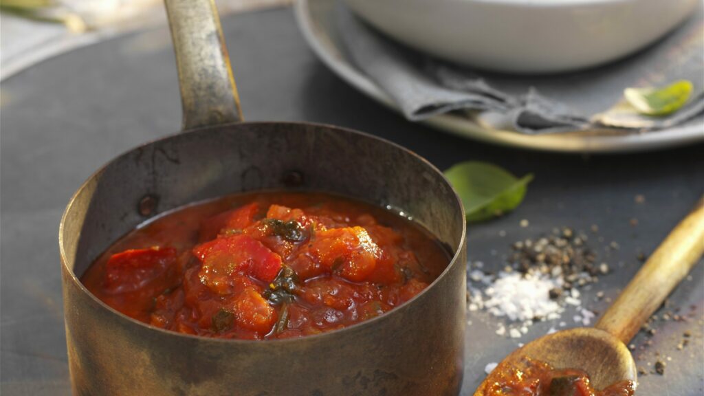 1. Poista chileistä siemenet. Hienonna chilit ja valkosipuli. Silppua muutama basilikan lehti. Kuumenna oliiviöljy paistinpannulla ja kypsennä chilejä ja valkosipulia minuutti. Lisää basilika ja jatka kypsennystä taas minuutti. Kaada joukkoon tomaattimurska ja keitä kokoon vähintään 10 minuuttia. Mausta suolalla ja pippurilla.