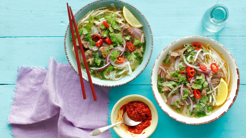 Vietnamilainen pho-keitto valmistetaan naudanlihasta, mausteisesta lihaliemestä, riisinuudeleista ja yrteistä. Saa ryystää!