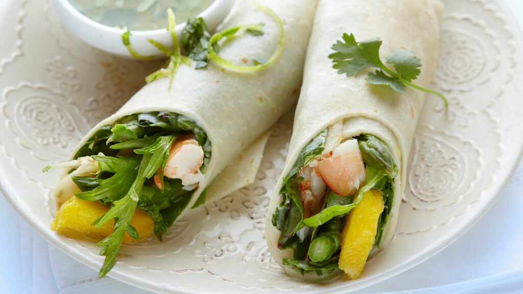 5. Lämmitä tortillat ja täytä katkarapusalaatilla ja kääri rullalle. Koristele korianterilla ja tarjoile limettidipin kanssa.