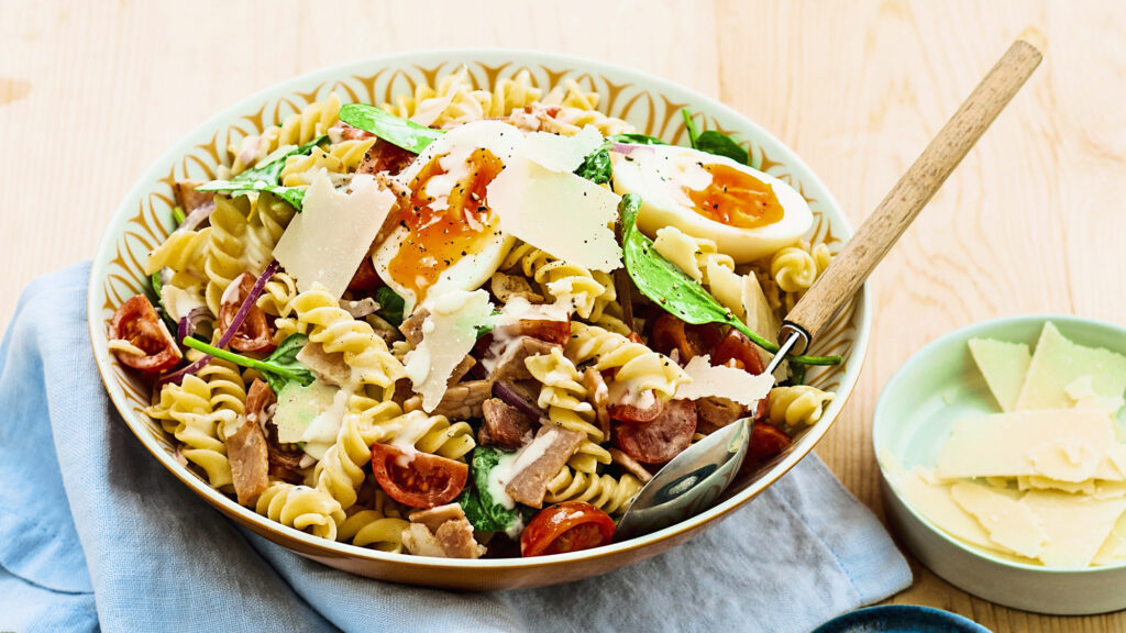 6. Kaada pasta tarjoiluastiaan ja viimeistele se munanpuolikkailla ja raastetulla parmesaanilla.