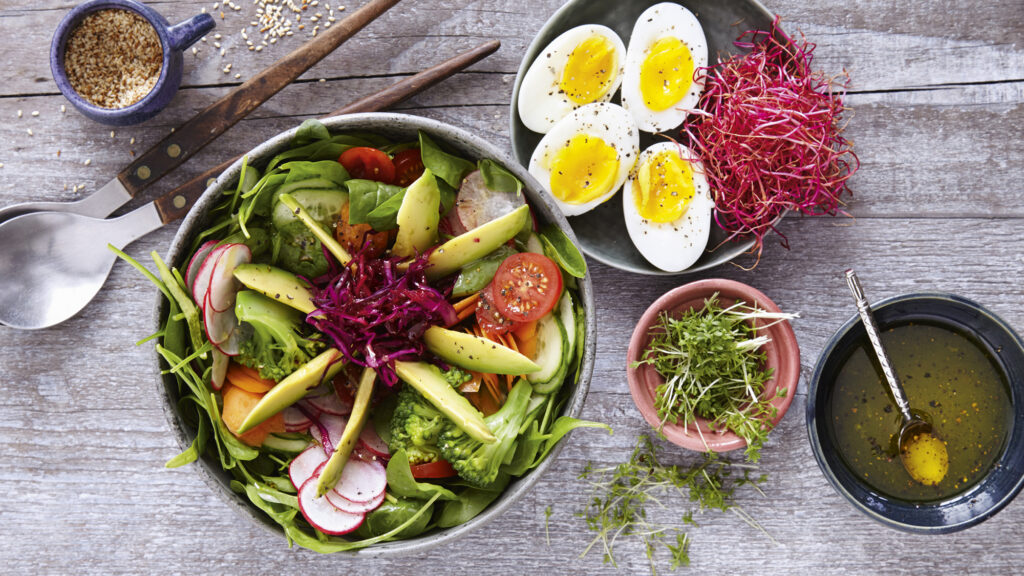 6. Kuori munat ja leikkaa ne puolikkaiksi. Paahda seesaminsiemenet. Tarjoa munat seesaminsiementen kanssa salaatin ohessa.