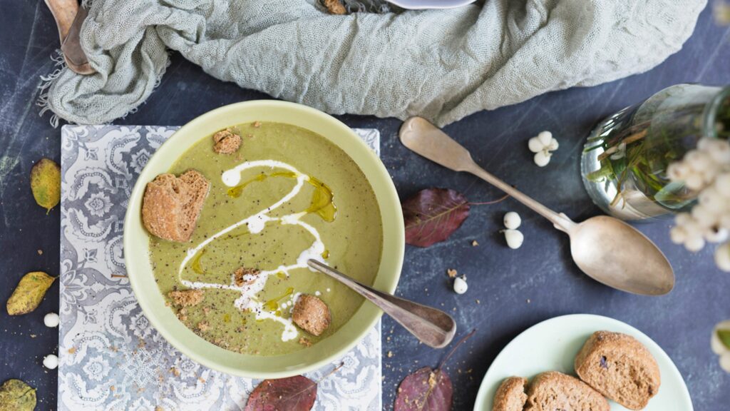 6. Kuumenna keitto kattilassa uudestaan. Annostele kulhoihin ja koristele oliiviöljyllä ja pienellä ripauksella kermaa. Rouhi päälle vielä ripaus mustapippuria. Tarjoile leivän kera.