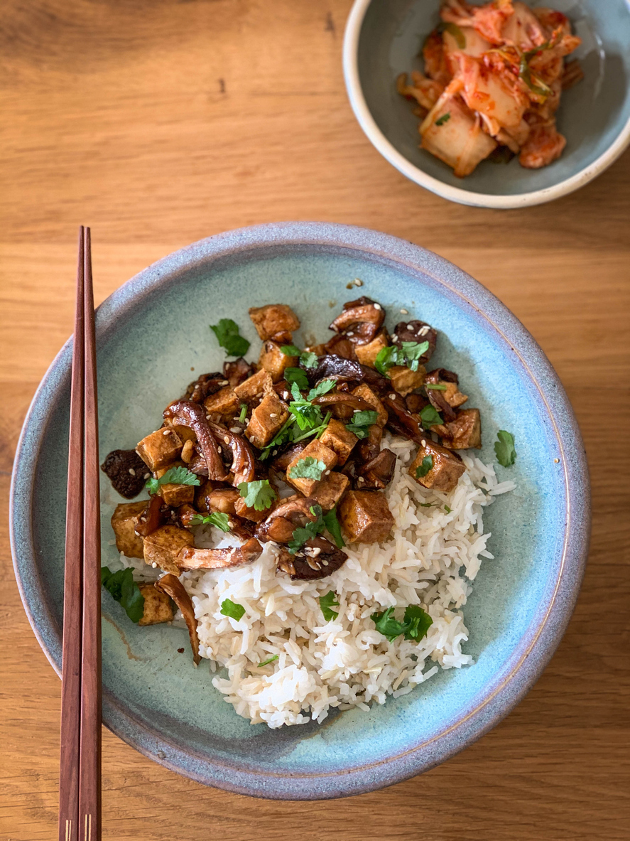 5. Kuumenna öljyä pannulla ja paista hetki sipulia, kaalia ja sieniä. Lisää marinadi sekä tofu ja jatka paistamista, kunnes paistos on karamellisoitunut. Lisää lopuksi seesaminsiemeniä.