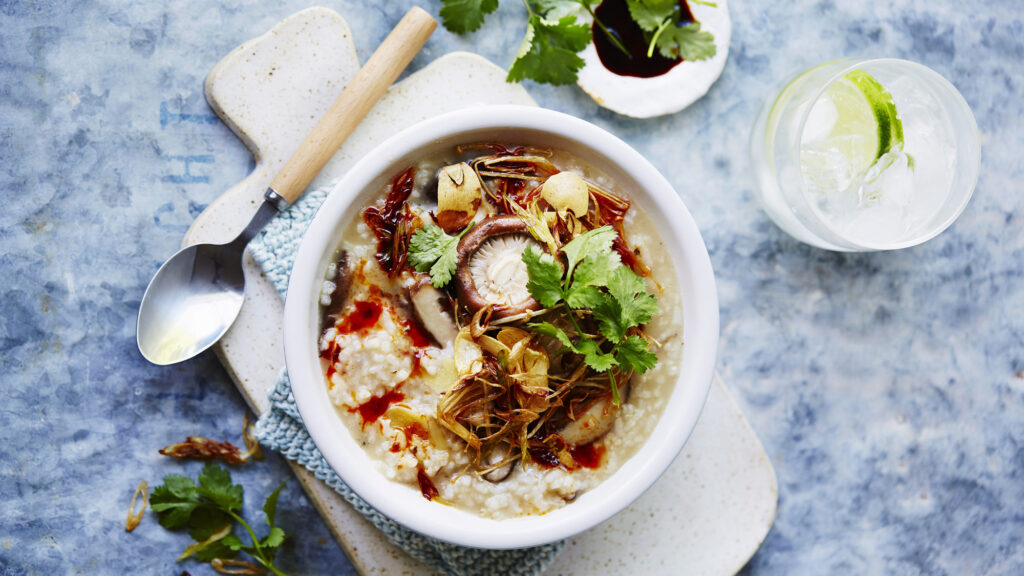 - Jaa congee lautasille ja nostele päälle sipuli–sieniseosta. Ripottele päälle vielä chiliöljyä ja koristele korianterisilpulla.