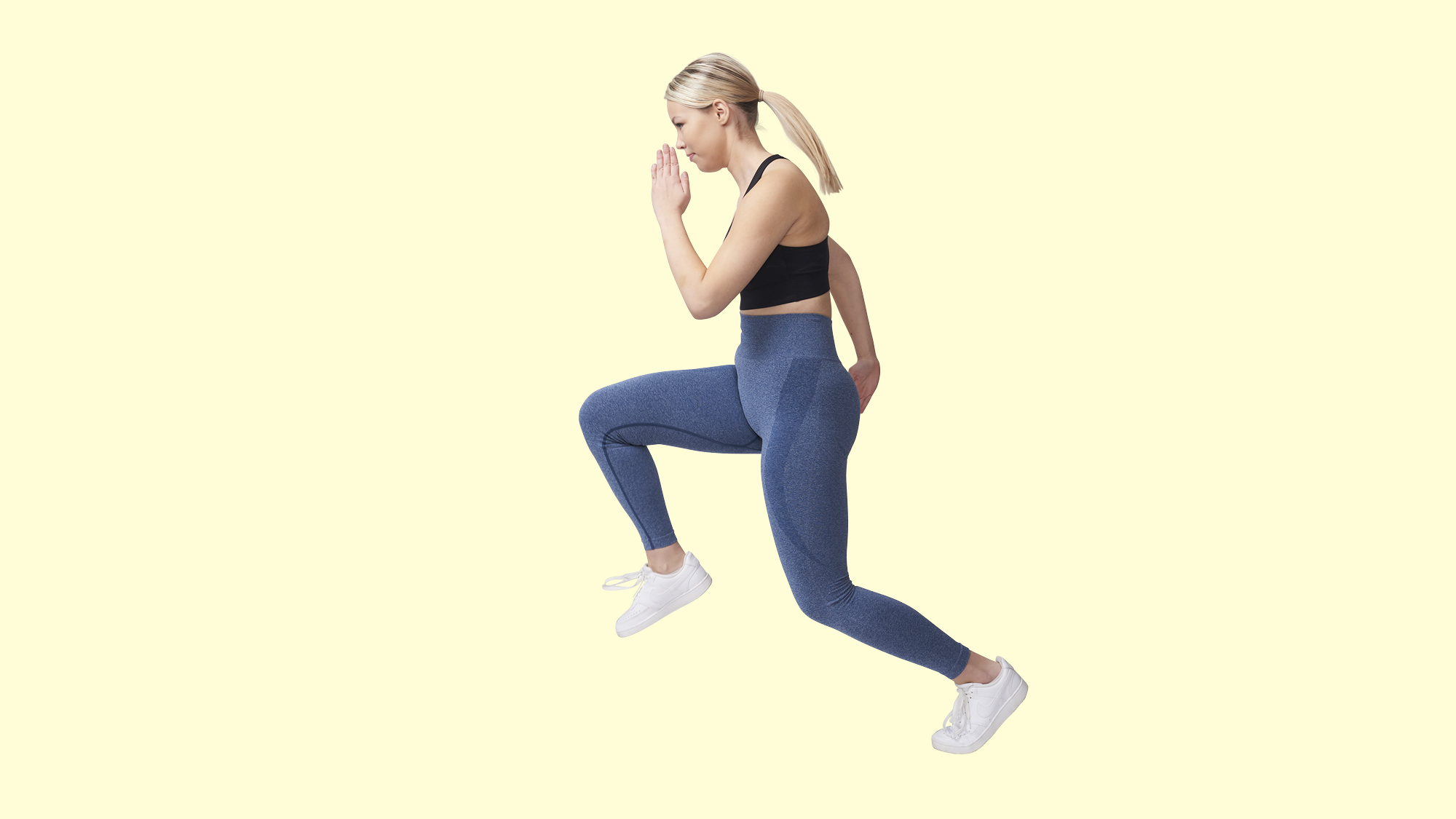 Astu vasen jalka lantionleveydeltä suoraan taakse. Ota niin pitkä askel, että vasen kantapää on irti lattiasta. Laskeudu rauhalliseen tempoon askelkyykkyyn niin, että oikea reisi on vaakatasossa lattiaan nähden. Ponnista ala-asennosta räjähtävästi ylös ja nosta samalla oikea polvi mahdollisimman korkealle. Toista uudelleen. Palautuksen jälkeen vaihda jalat toisinpäin ja toista sama toiselle puolelle. Jos polven nostaminen tuntuu pahalta, liikkeen voi tehdä myös niin, että askelkyykystä noustessa nostaa vain kantapään lattiasta.