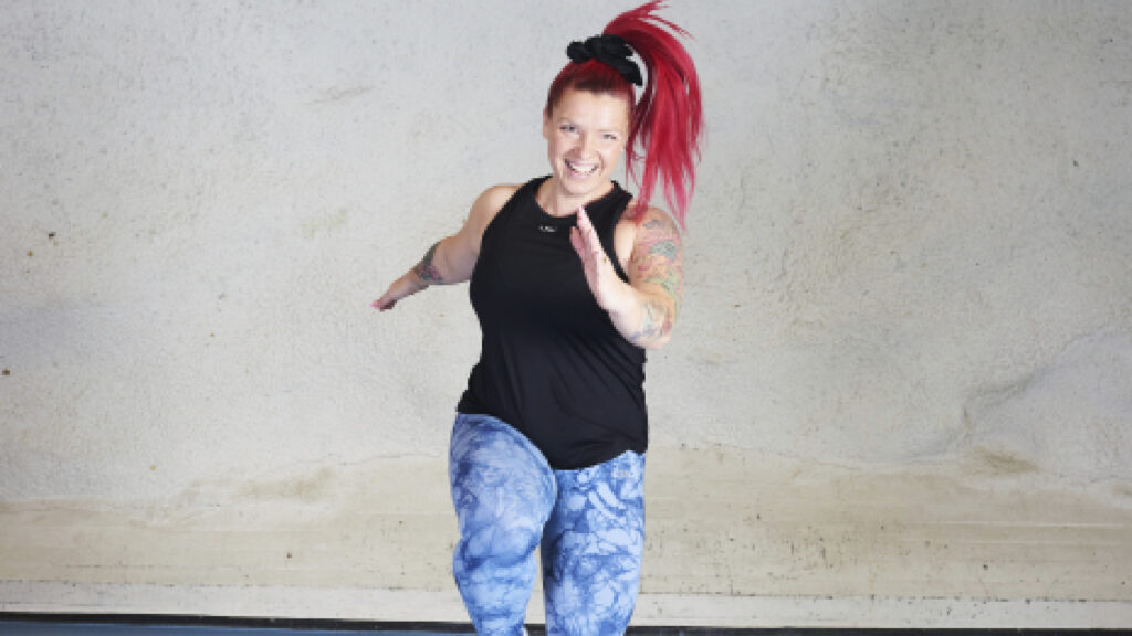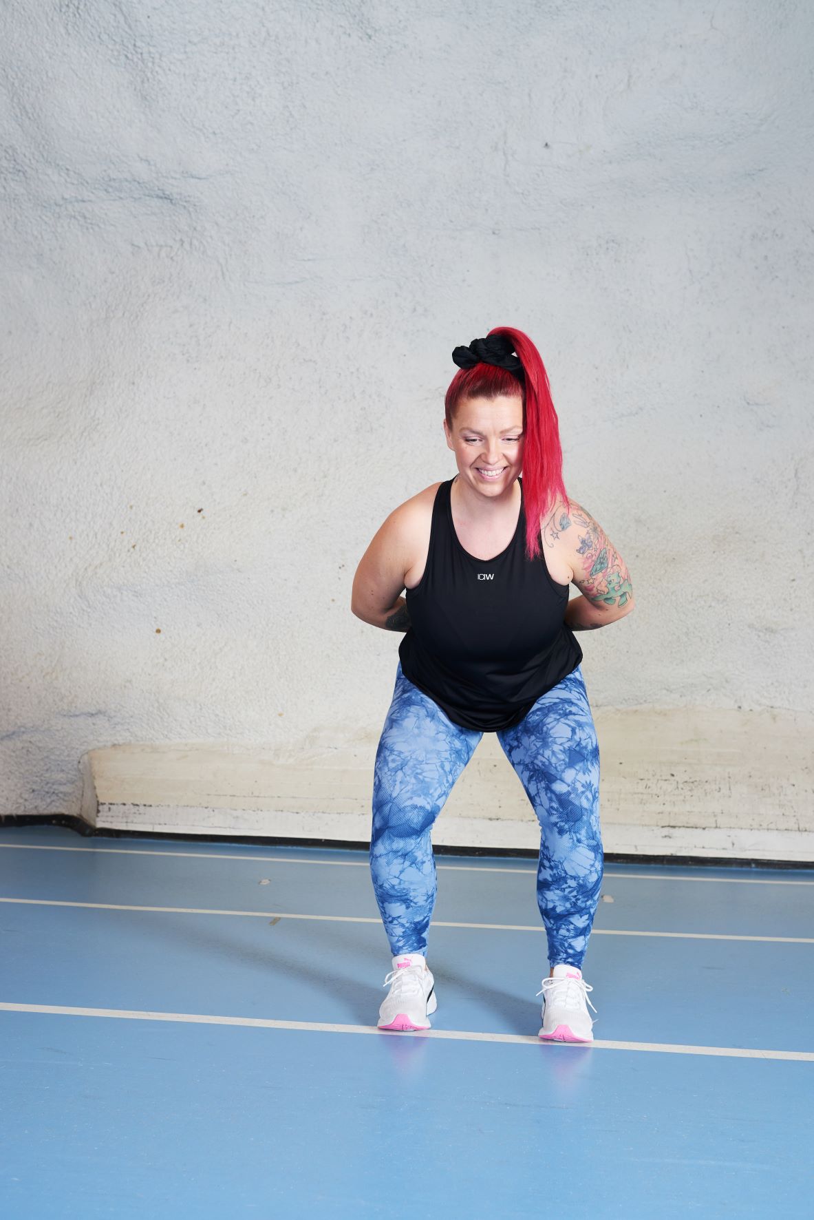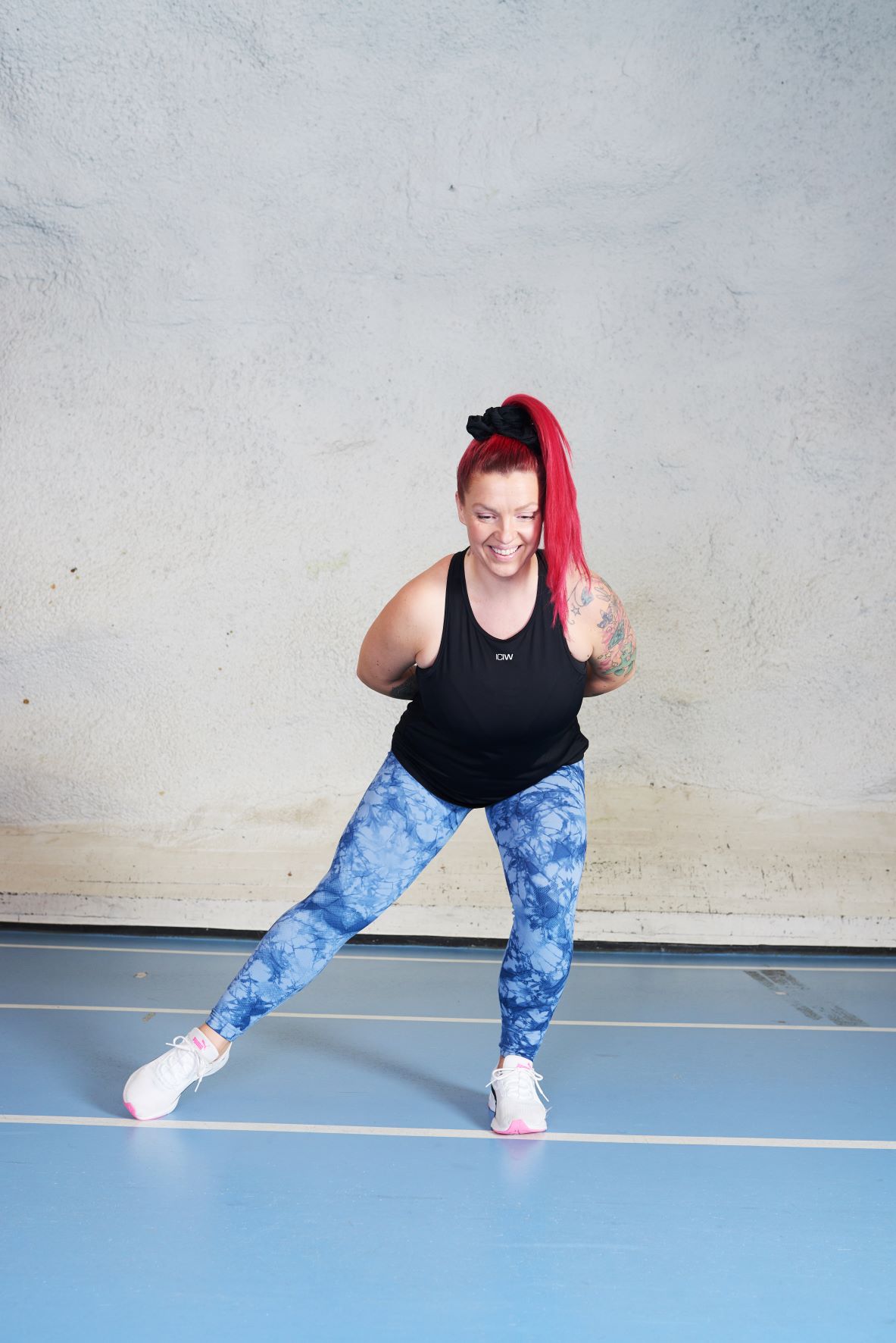 Lähde viemään toista jalkaa vartalon taakse ristiin. Muista pitää etummaisen jalan kantapää koko ajan maassa. Kun taakse suuntaava jalka on takana, tee kyykky. Nouse ylös ja täppää jalka kevyesti tukijalan viereen. Toista liike uudestaan.