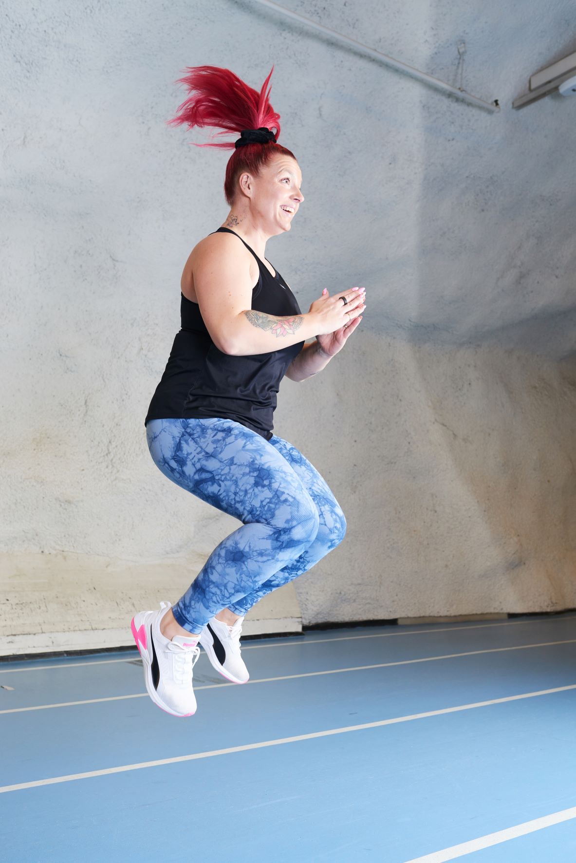 Asetu lantion levyiseen haara-asentoon. Polvet ja varpaat osoittavat samaan suuntaan. Laskeudu kyykkyyn, nouse ylös ja hyppää vauhdikkaasti eteenpäin. Pidä huoli, että polvet eivät käänny sisäänpäin ponnistaessasi.
